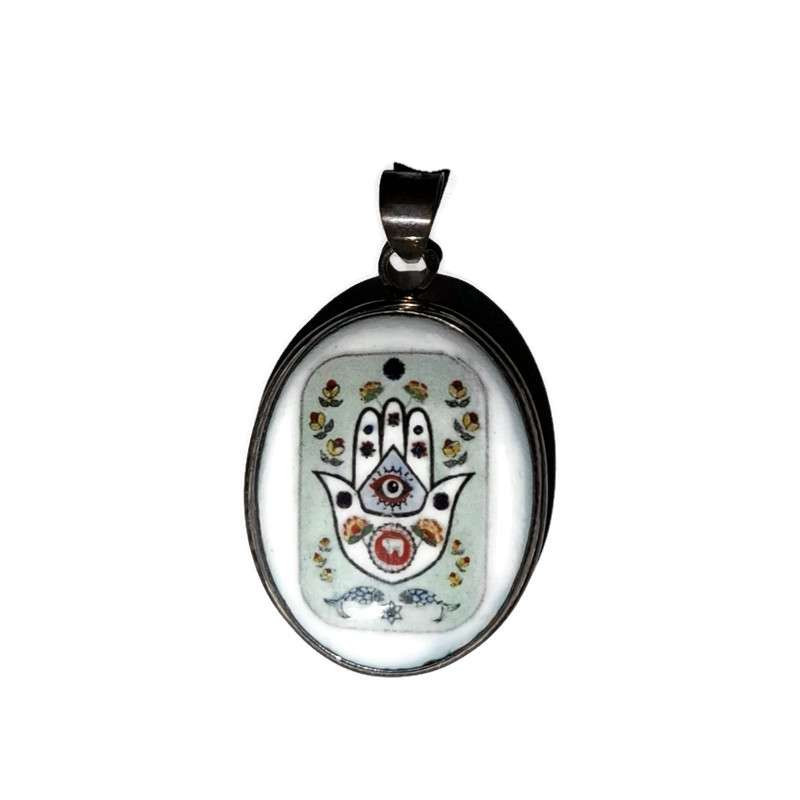 Ez a kézműves ezüst tűzzománc medál a spirituális védelem egyik legősibb jelét, a Hamsa kezet ábrázolja. A nyitott tenyér a gonosz és a negatív energiák elleni védelmet jelképezi, a közepén elhelyezett Szem motívum pedig az éberséget, a tudatosságot és a belső látást szimbolizálja.