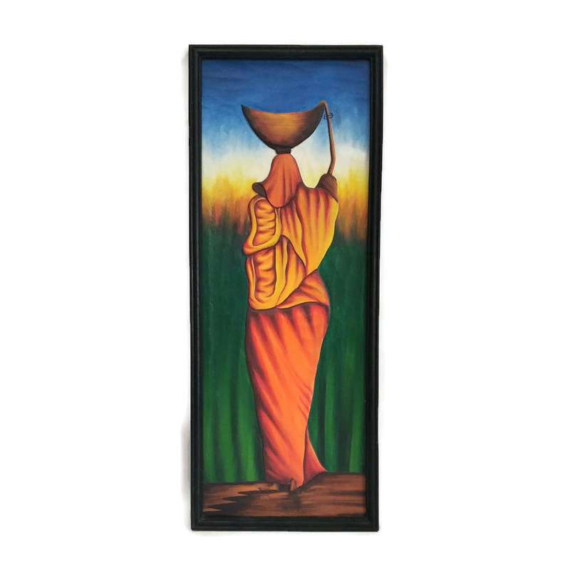 Fa kép, afrikai hölgy narancs ruhában, tállal, 1 alak