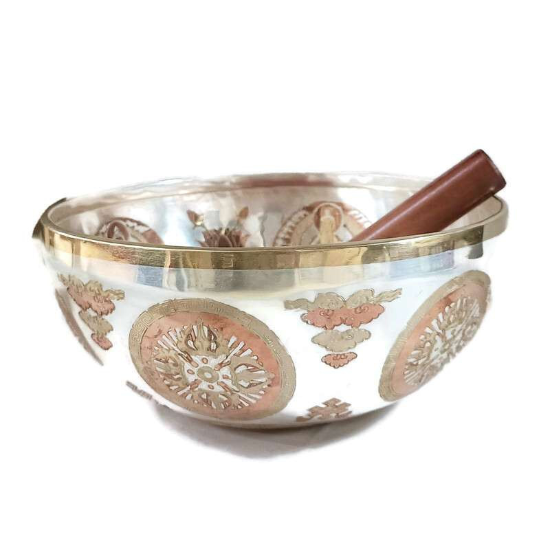 Ezüstözött, díszes hangtál, Buddha Sákjamuni és az öt Dhjáni Buddha vésett képeivel. A tálat továbbá olyan kedvező szimbólumok díszítik, mint a kettős dordzse, a lótuszvirág és a végtelen csomó, valamint az együttérzés mantrája, az „Om Mani Pad Me Hum”.
