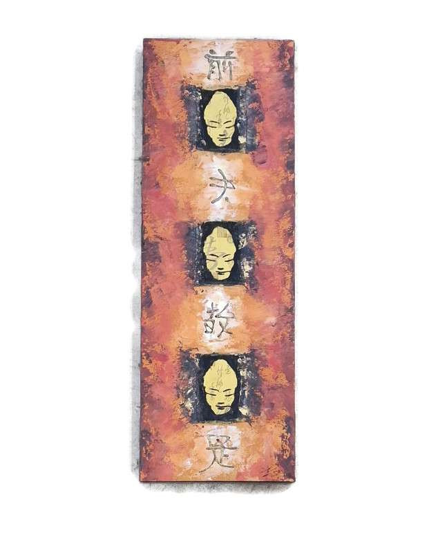 Ez a kézzel festett akril vászonkép egyedi művészi alkotás, amely három aranyszínű Buddha arcot ábrázol egy lenyűgöző narancs-fekete háttéren. A festmény keskeny, hosszúkás formája modern és stílusos megjelenést kölcsönöz, így tökéletes választás lehet meditációs terek, nappalik vagy irodák dekorálásához.