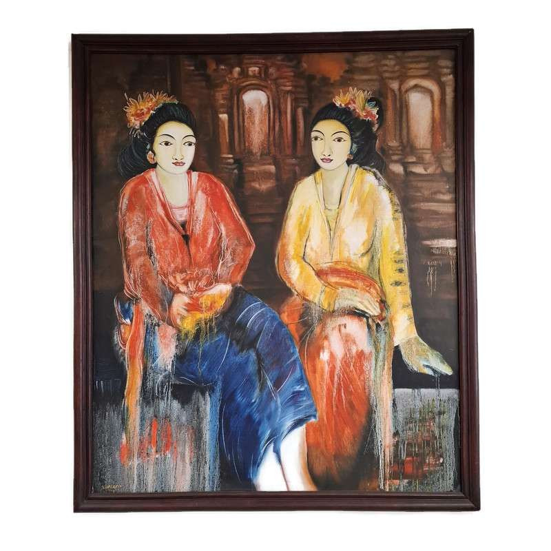 Ez a kézzel festett balinéz vászonkép keretben, két teljes alakos nő ábrázolás, akik meghitt beszélgetésbe merülve idézik meg a balinéz kultúrára jellemző mély emberi kapcsolódás időtlen pillanatait. A festmény élénk kék, piros, sárga és barna színeivel meleg, harmonikus hangulatot áraszt, miközben az ábrázolt jelenet nyugalmat és bensőséget sugároz.