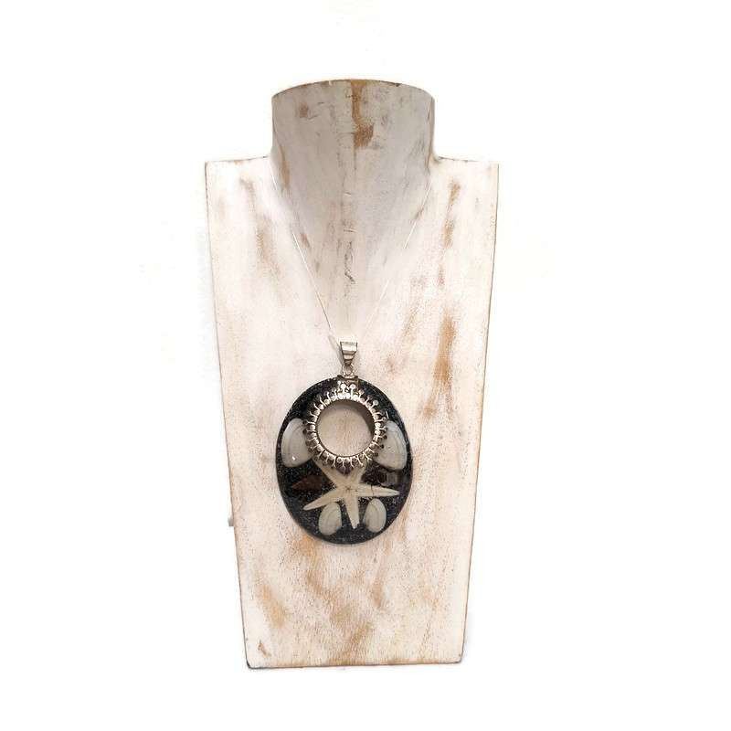 A tengeri csillag és a finoman megmunkált ezüst karikás motívum harmóniát teremtenek a természetes és az időtálló anyagok között, így ez az egyedi medál ideális választás a természetes, de kifejező stílus kedvelőinek.