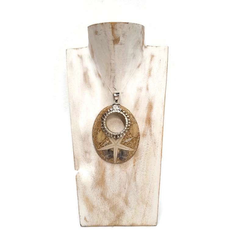 A medál homokszínű, áttetsző, fényes felületű műgyanta alapja kiemeli a tengeri csillag finom formáját, míg az ezüst karikás motívum tovább erősíti a tenger ihlette, elegáns megjelenést.
