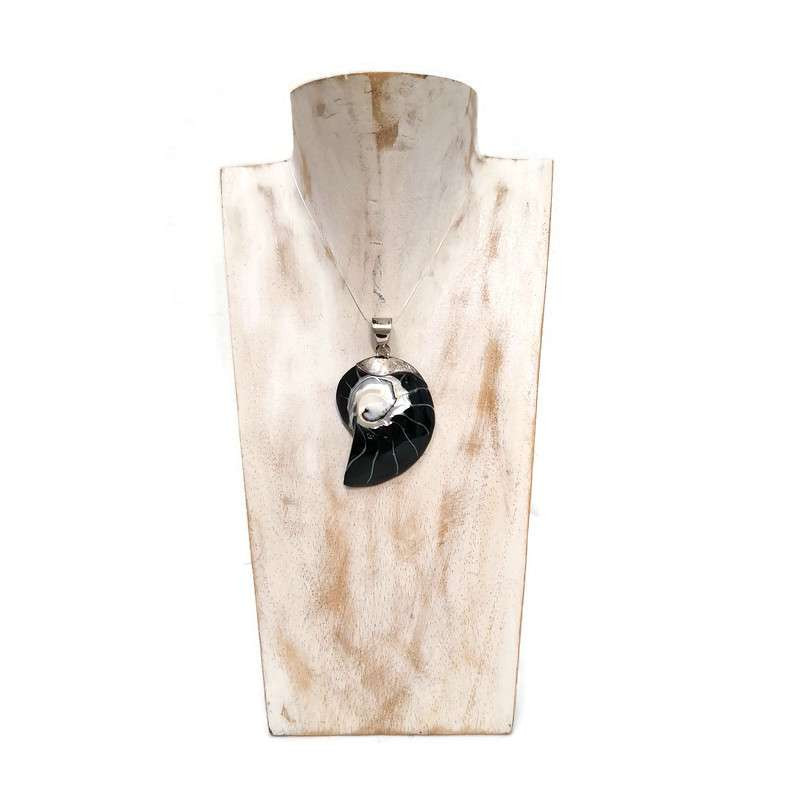 A medált precíz csiszolás után a csigaház mintázata és a műgyanta kontrasztosan érvényesül. A csigaházhoz kapcsolódó, letisztult ezüst díszítés egyszerűen és visszafogottan egészíti ki a medált, anélkül, hogy keretezné vagy elvonná róla a figyelmet.