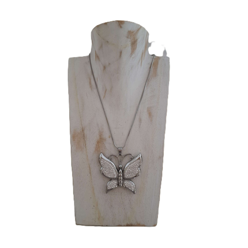 Ez a nagyméretű pillangó medál különleges ékszer, amely egyszerre hordozza a természetesség szépségét és a mélyebb szimbolikus jelentést. A natúr kristályüveg kövek tiszta ragyogása univerzális, bármilyen öltözethez illeszkedik, miközben a nemesacél foglalat garantálja a tartósságot és a modern eleganciát.