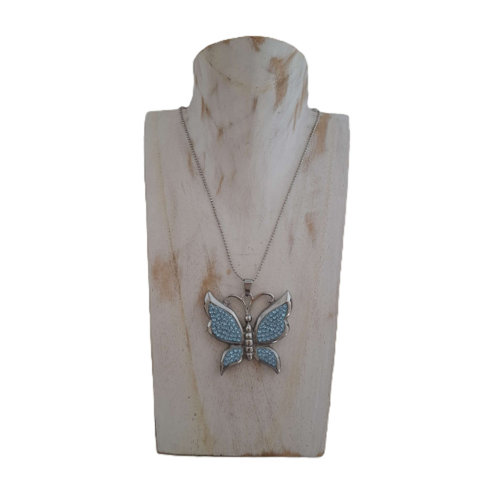Ez a nagyméretű pillangó medál kifinomult kiegészítő, amely egyszerre elegáns és szimbolikus. A világoskék kristályüveg kövek ragyogása üde és légies hatást kelt, a nemesacél foglalat pedig tartósságot és modern eleganciát biztosít.