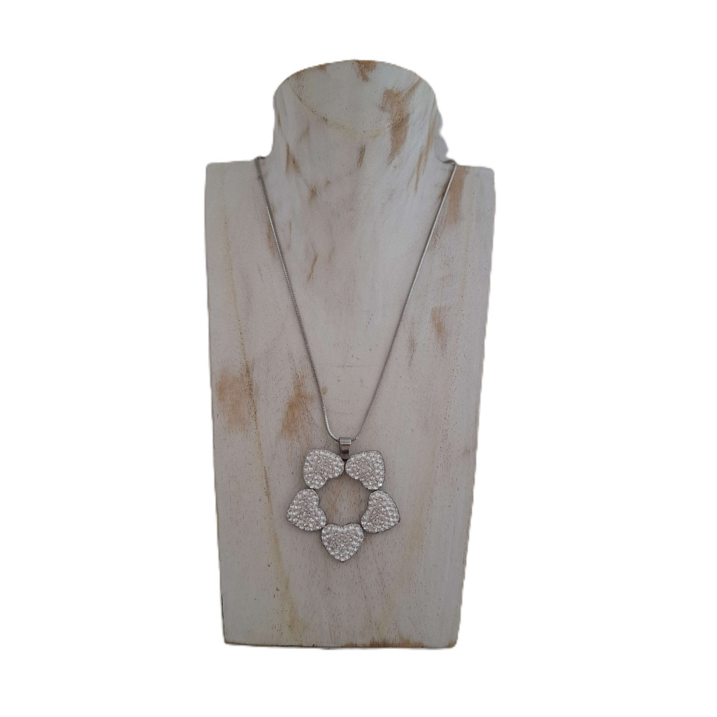 Ez a nemesacél medál virágformát alkot 5 szívecskével, melyek mindegyike apró natúr kristályüveg kövekkel van kirakva. A csillogó kövek finom részletgazdagságot és légies hatást kölcsönöznek az ékszernek. A virág a növekedést, a megújulást és a harmóniát szimbolizálja, míg a szívecskék a szeretetet és az érzelmi egyensúlyt képviselik. Az 5-ös szám a változás, a kreativitás és az új lehetőségek energiáit hordozza, támogatva a viselő belső fejlődését.