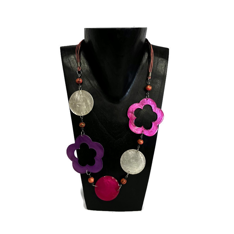 Nyaklánc, női, lila áttört kagyló, áttört négyzet fa