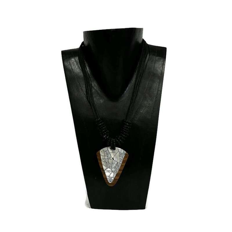 Anyaga: kagyló, viaszolt cotton zsinór, akril, fa