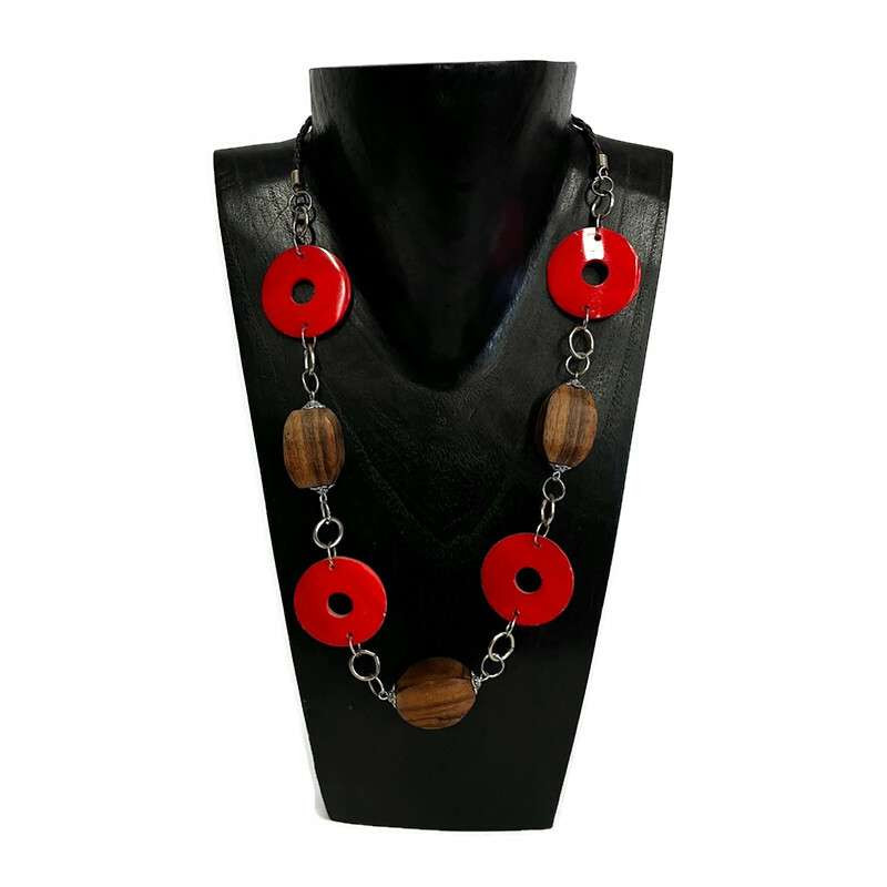 Nyaklánc, női, piros áttört kagyló, szögletes fa gyönggyel