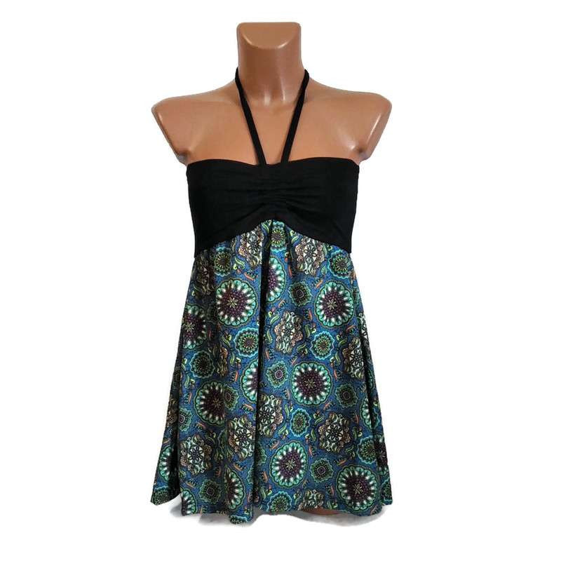 Tökéletes alapdarabja lehet a nyári ruhatáradnak, mert nem csak egy mutatós szoknyára tehetsz szert, hanem egy dekoratív nyakba kötős felsőre is egyszerre. Bátran hordható mindkét verzióban egyaránt.