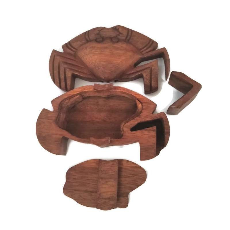 Fából kézzel faragott doboz, melynek kinyitása leleményességet igényel.