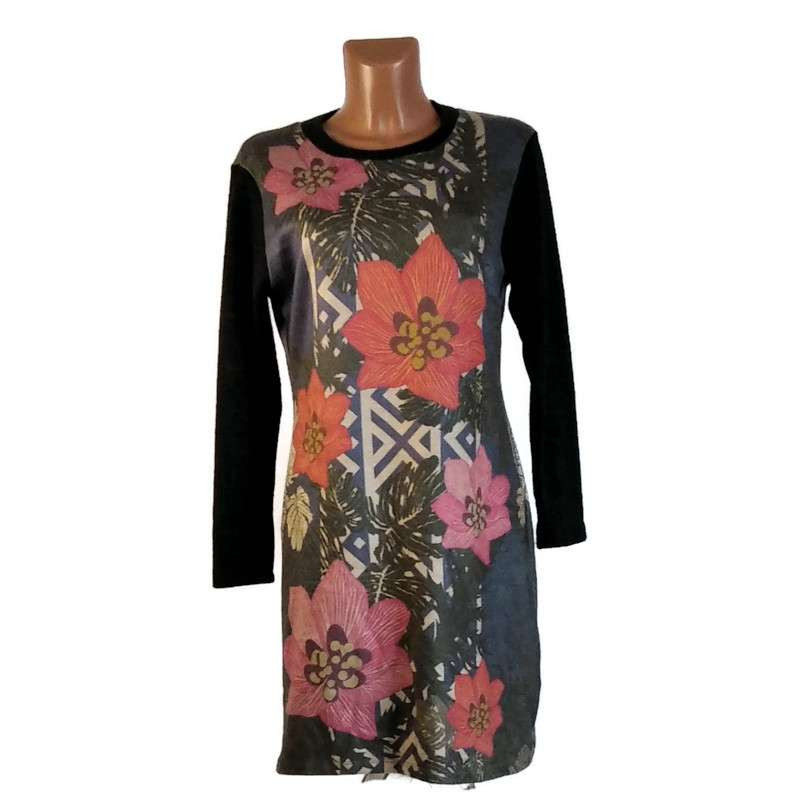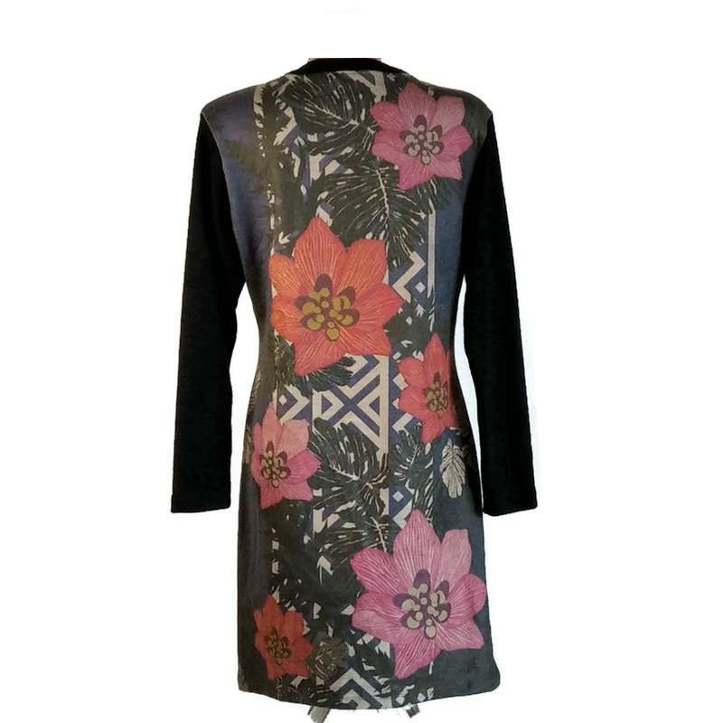 UDG hosszú fekete ujjú ruha, piros-rózsaszín virágos