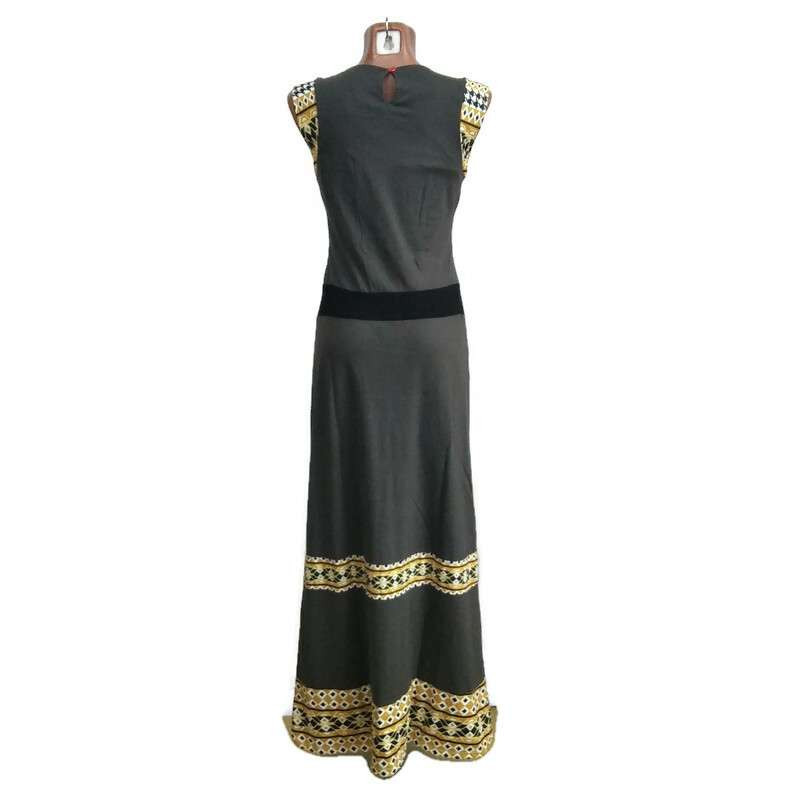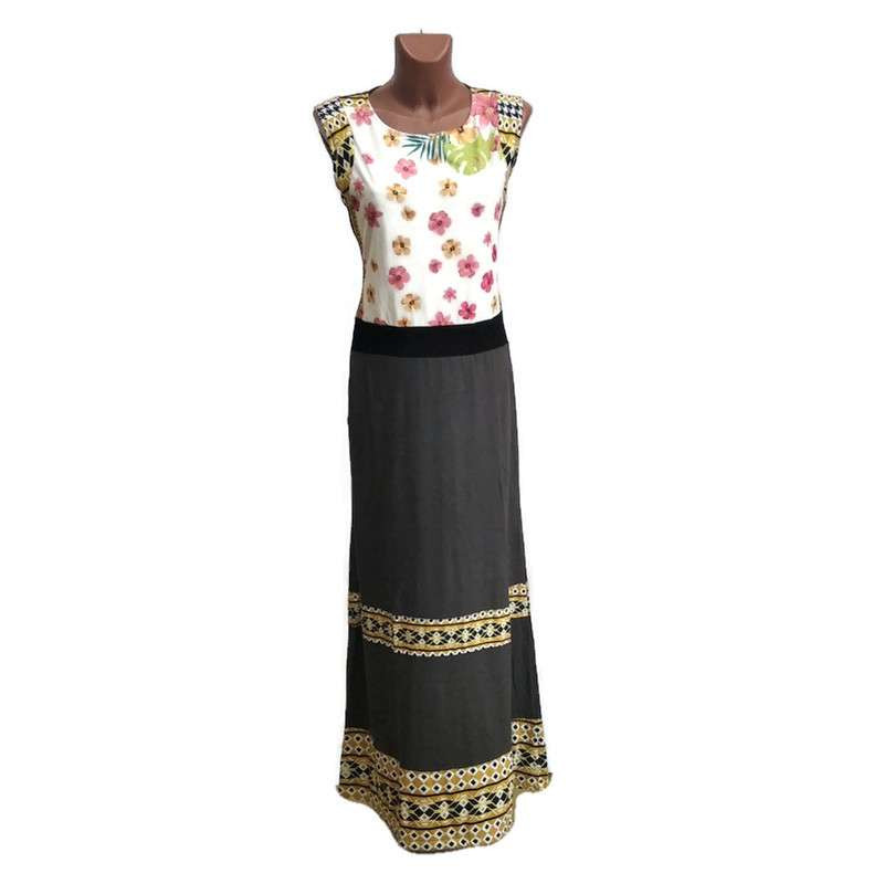 UDG hosszú ruha, földszürke, fehér alapon rózsaszín virágos mintás felsőrésszel