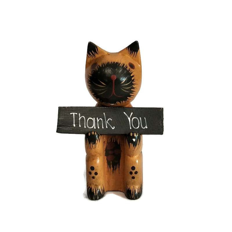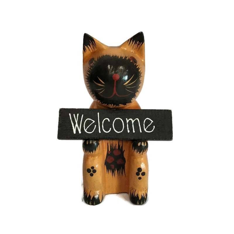 Ülő köszöntő macska táblával. Egyik oldalán "Isten hozott"(Welcome), a másikon "Köszönöm"(Thank you) angol nyelvű felirattal.