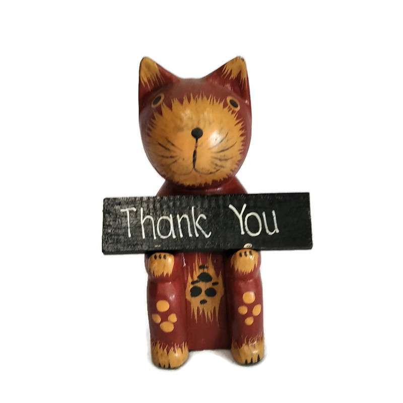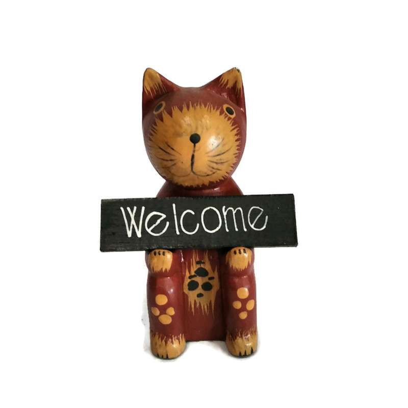Ülő köszöntő macska táblával. Egyik oldalán "Isten hozott"(Welcome), a másikon "Köszönöm"(Thank you) angol nyelvű felirattal.