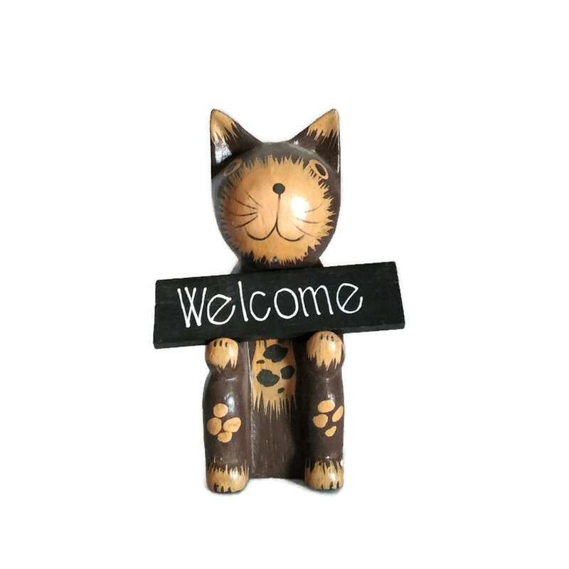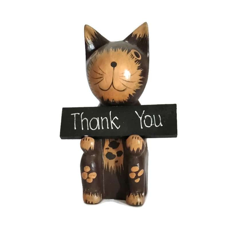 Ülő köszöntő macska táblával. Egyik oldalán "Isten hozott"(Welcome), a másikon "Köszönöm"(Thank you) angol nyelvű felirattal.