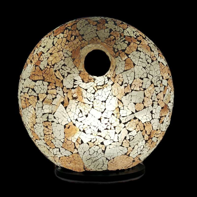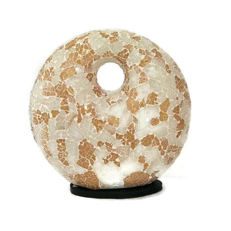 Egyedi lámpabúra fa talpon. A kézzel festett üvegdarabok műanyag búrára egyesével vannak rögzítve, ezáltal minden darab különleges. Kivilágítás nélkül is ékkövei lehetnek lakásunknak.