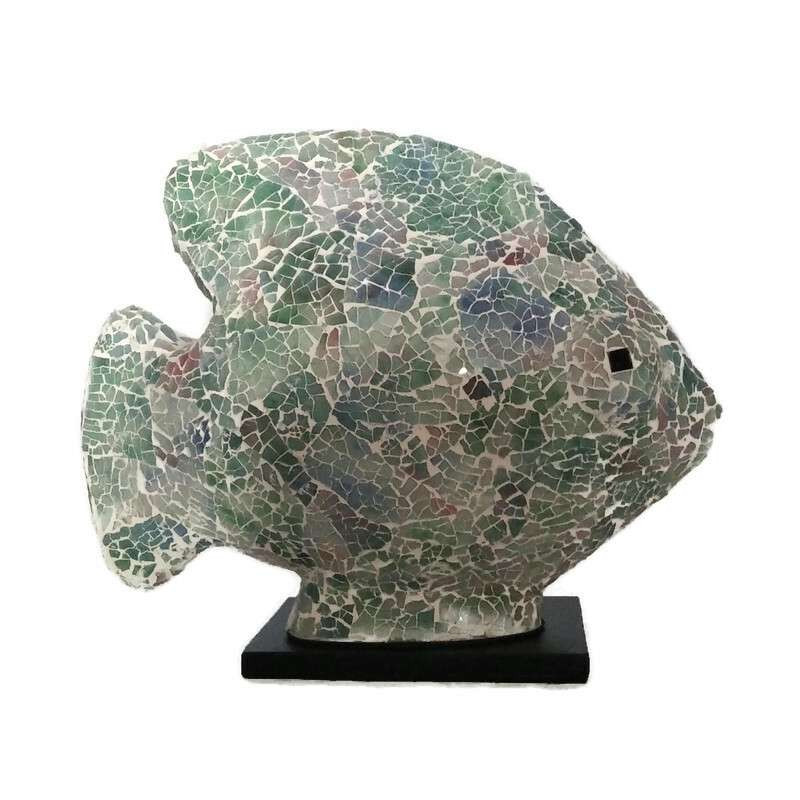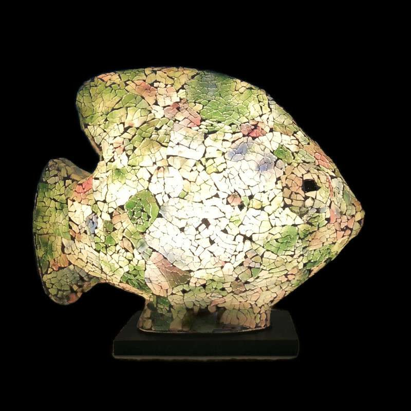 Egyedi lámpabúra fa talpon. A kézzel festett üvegdarabok műanyag búrára egyesével vannak rögzítve, ezáltal minden darab különleges. Kivilágítás nélkül is ékkövei lehetnek lakásunknak.