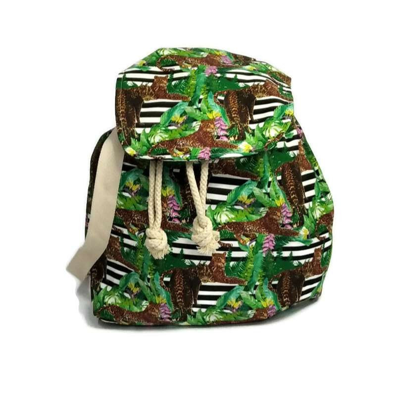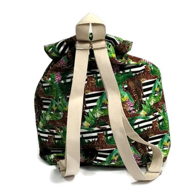 Zsinóros szájú hátizsák, fekete-fehér csíkos alapon leopárdos