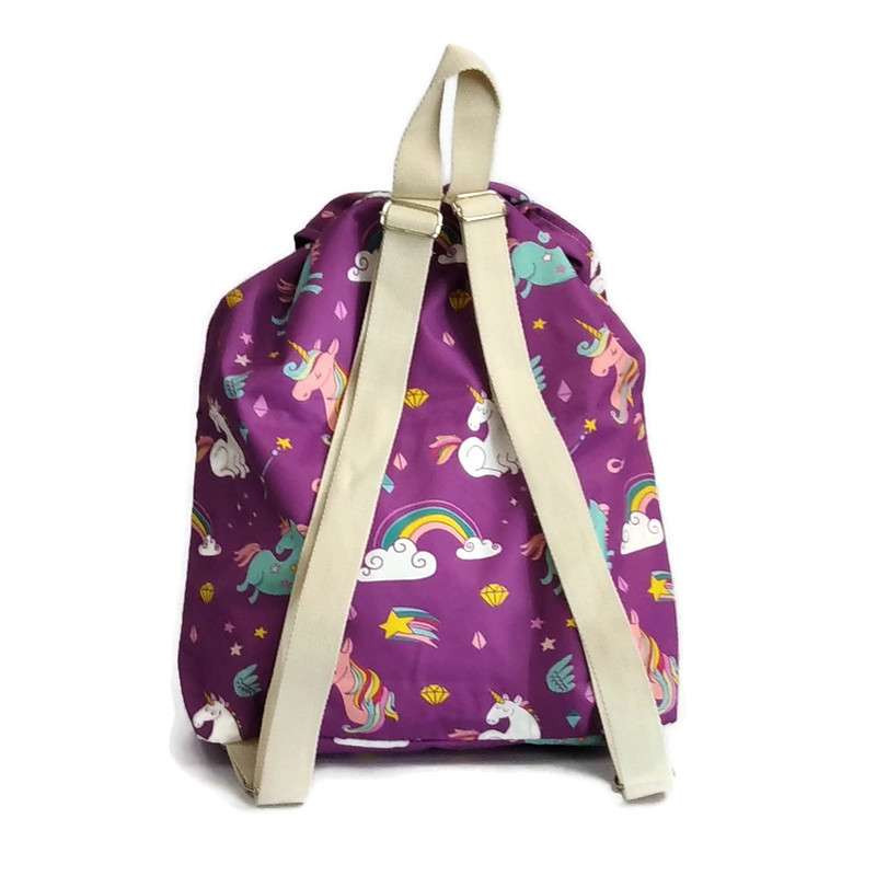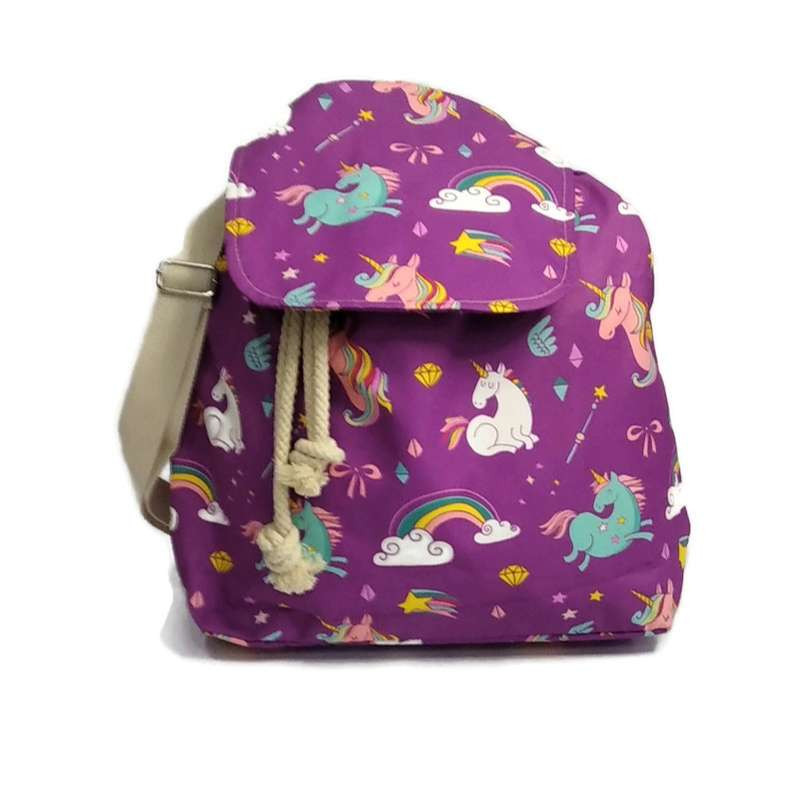 Zsinóros szájú hátizsák, lila alapon unikornis mintás