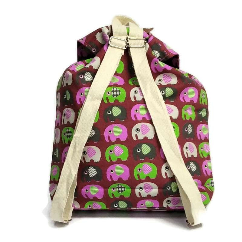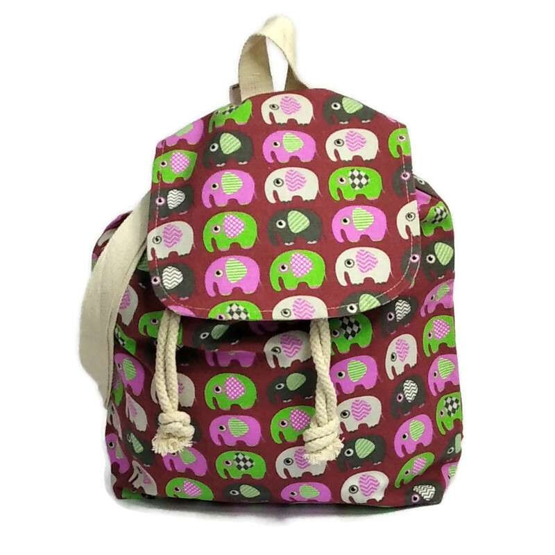 Zsinóros szájú hátizsák, téglavörös alapon elefánt mintás