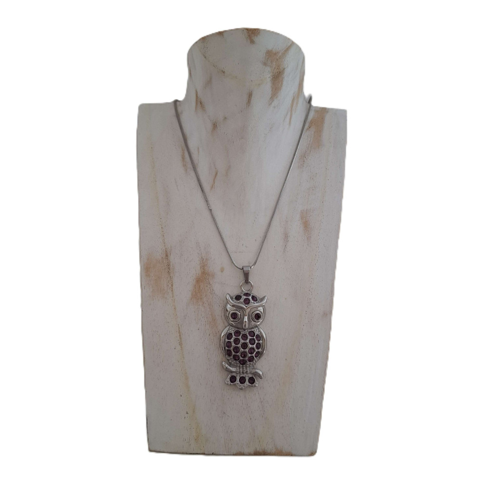 Ez a különleges bagoly medál a bölcsesség és a tisztánlátás szimbólumát hordozza magában. A lila kristályüveg finom csillogása misztikus hangulatot kölcsönöz az ékszernek, miközben a nemesacél foglalat biztosítja a tartósságot és az időtálló fényt.