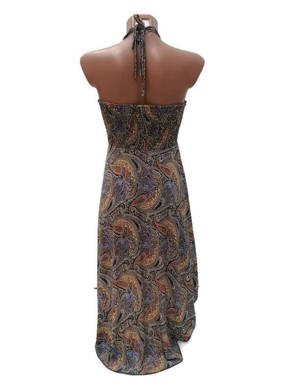 Rövid ruha, elöl rövid, hátul hosszabb fazon narancs-lila
