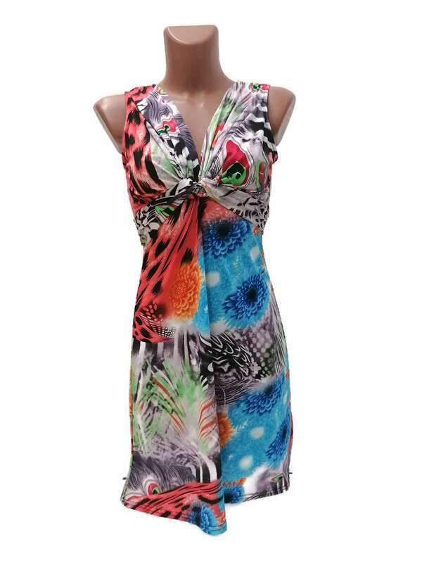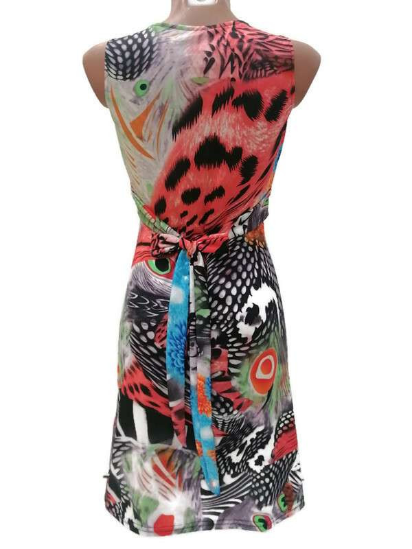 Rövid ruha, pávatoll és virág mintás, piros-kék
