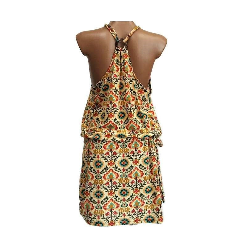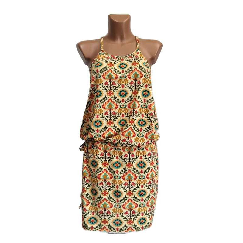 Virágos rövid ruha, vékony pántos vajszínű